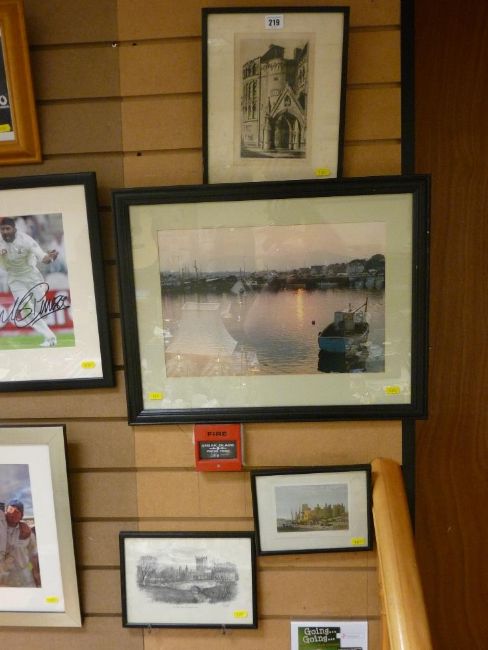 Framed etching of the entrance of Aberystwyth College, a framed etching of St David's Cathedral, a small framed print of Caernarfon Castle and a photograph of a harbour scene