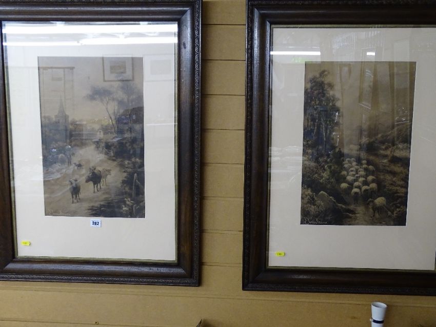ELMER KEENE two oak framed monoprints - cattle herder and a shepherd with their animals, 46 x 30 cms