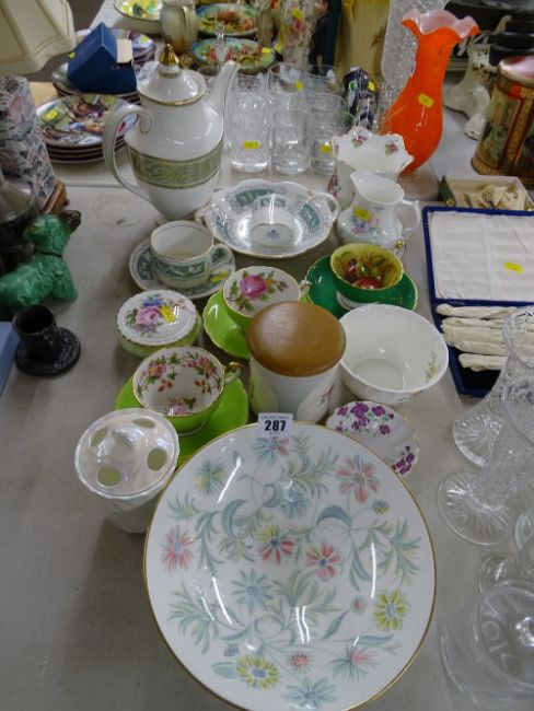 Selection of decorative china tableware including a fruit decorated Aynsley cup and saucer, a Minton 'Vanessa' fruit bowl, a Royal Doulton 'English Renaissance' coffee pot along with Coalport and other maker items