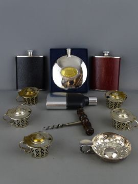 Four modern hip flasks, an EP wine tasting cup, five white metal lidded salt pots with blue glass liners and a wooden handled corkscrew