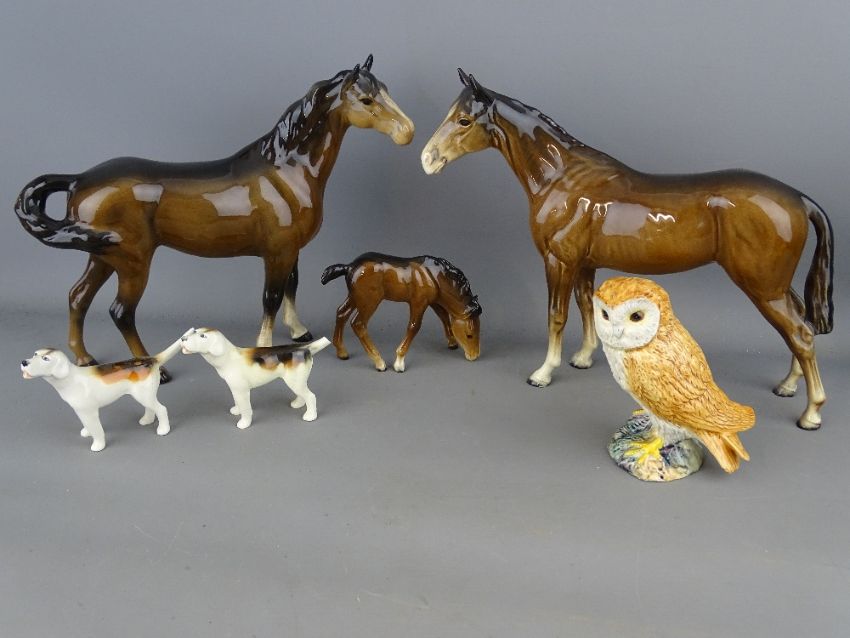 Two brown Beswick horses and a foal, a model of an owl and two hunting hounds, all with Beswick backstamps