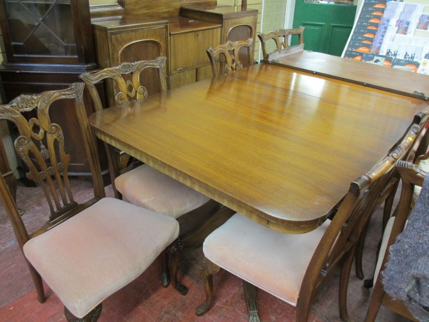 Mahogany extending dining table with eight (six plus two) Chippendale style chairs by Bevan Furniture and an Art Deco style sideboard with in-built cocktail cabinet