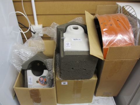 Two still packaged Woodstone For Life reconstituted stone birdboxes and a small boxed BBQ