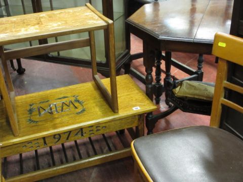 Small oak coffee table with monogram and 1974 carving to front, a small G-Plan occasional table, octagonal side table with lower galleried shelf and parcel of four mid Century kitchen chairs