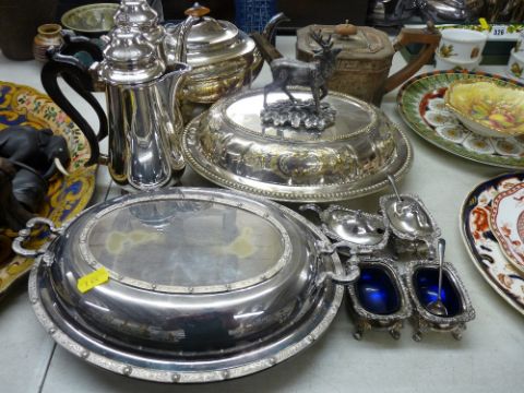 Stag topped EP entree dish and one other, a four piece salt and mustard set and four various EP tea and coffee pots