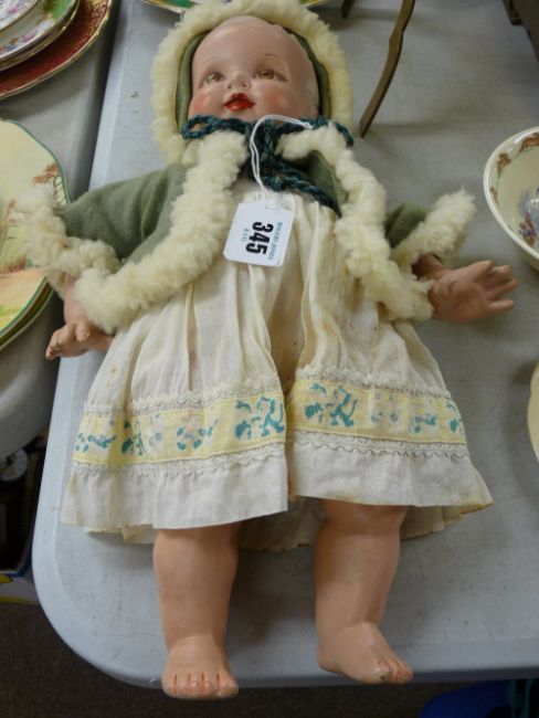 Dean's Ragbook Co composition doll with painted facial details, incised to the rear 'D R B Co Ltd', dressed in vintage style clothing with furry edged cape