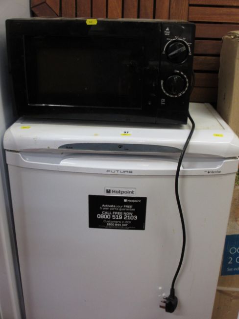 Hotpoint Future undercounter fridge and a black microwave oven E/T