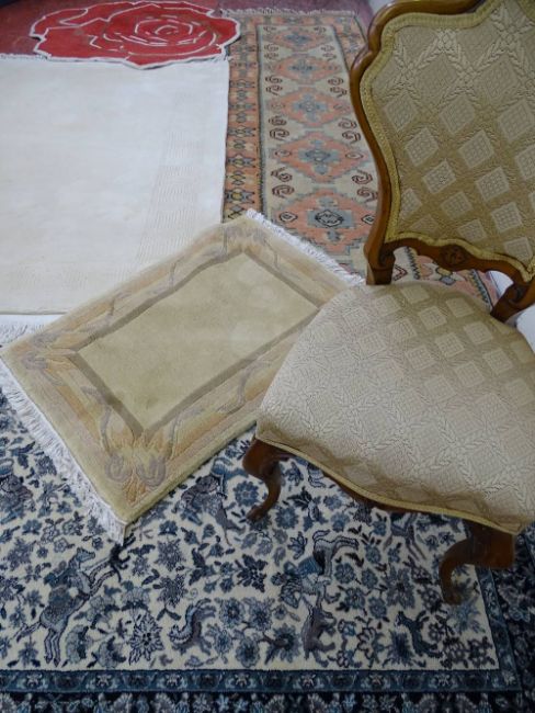Classically upholstered bedroom chair and a quantity of quality rugs, some by Ffrith