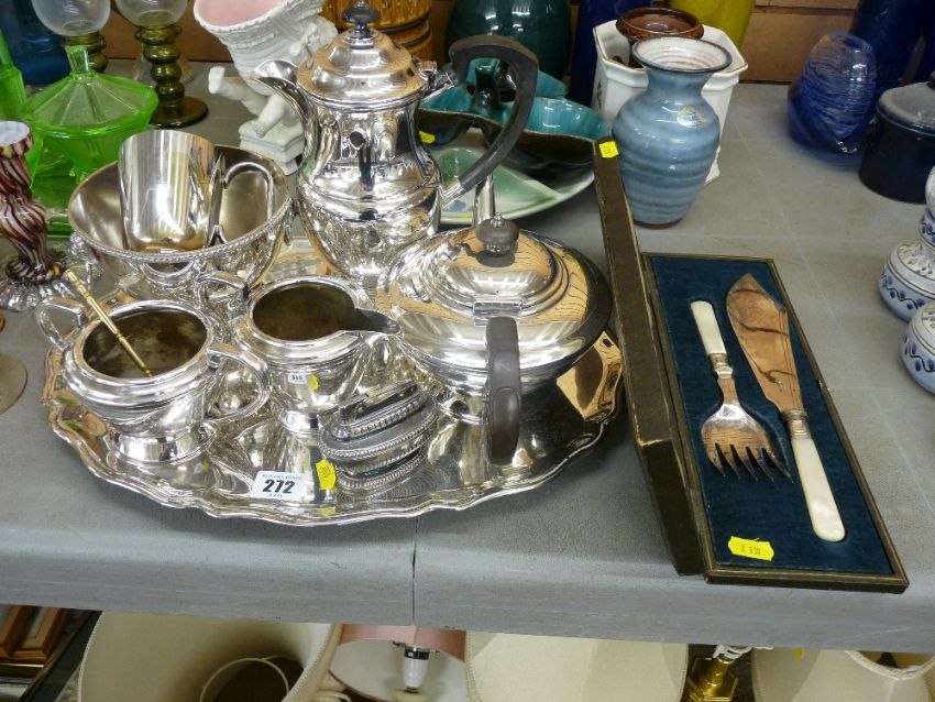 Four piece Mappin & Webb EPNS teaset on a wavy bordered tray, a vintage Ronson table lighter and other plated ware etc