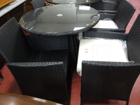 Black rattan patio set comprising circular table with glass top and four armchairs