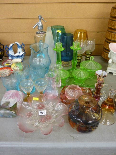 Uranium glass dressing table set, a Mdina vase along with a mixed selection of other colourful glassware