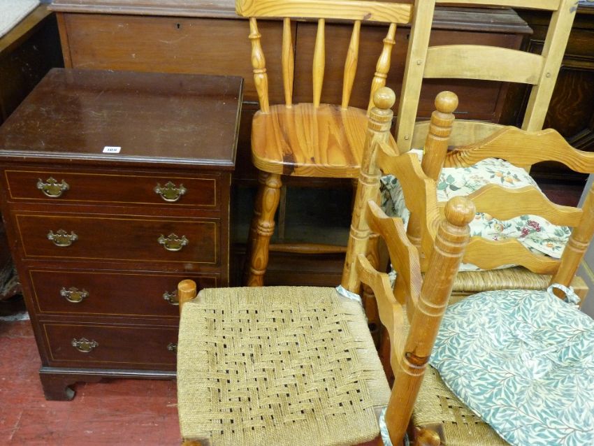 Polished bedroom chest of four graduated drawers with drop handles, parcel of two pine woven seat dining chairs, one pine ladderback rush seated chair and a pine high bar stool