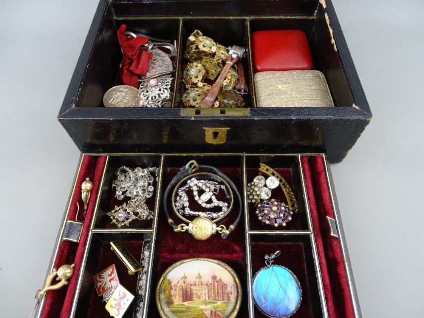 Vintage jewellery box and contents including an eighteen carat gold cased lady's watch, a silver and butterfly wing pendant, a possibly gold and enamel diamond chip mounted brooch, an enamel and colourful stone decorated peacock brooch and other good items of Victorian and later jewellery