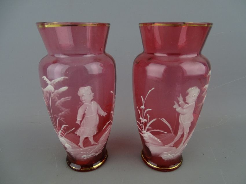 Pair of cranberry glass Mary Gregory style decorated vases, 14 cms high