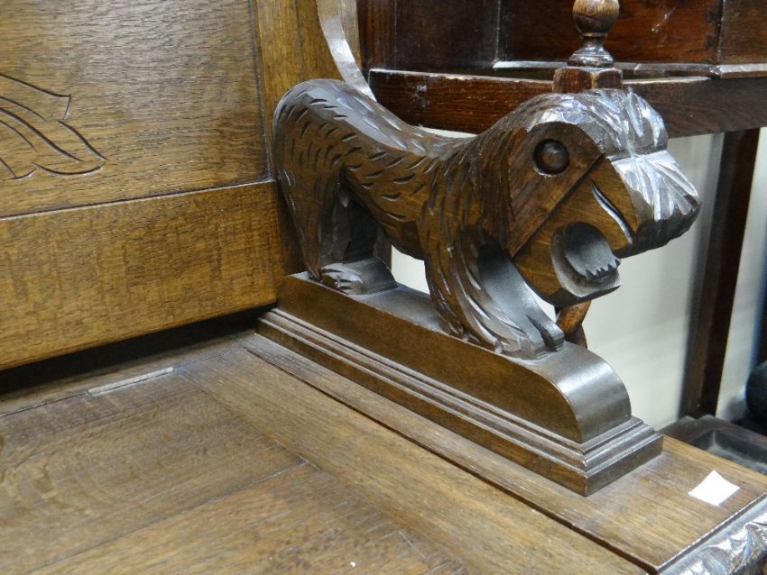 A good vintage carved oak monk's bench with box seat and carved lion-form arms, 105cms wide