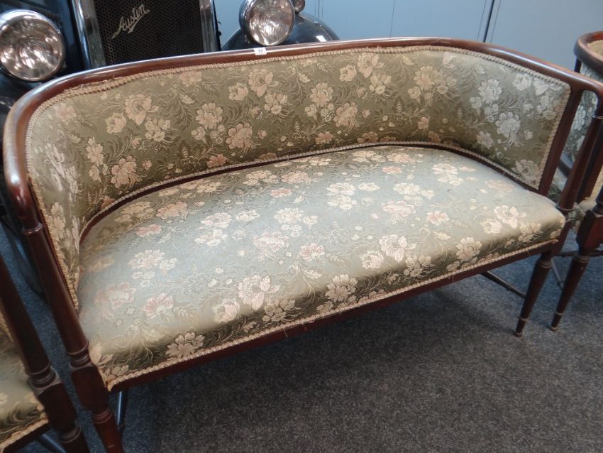 An antique / vintage three-piece floral upholstered antique tub-style suite comprising two armchairs and two-seater settee