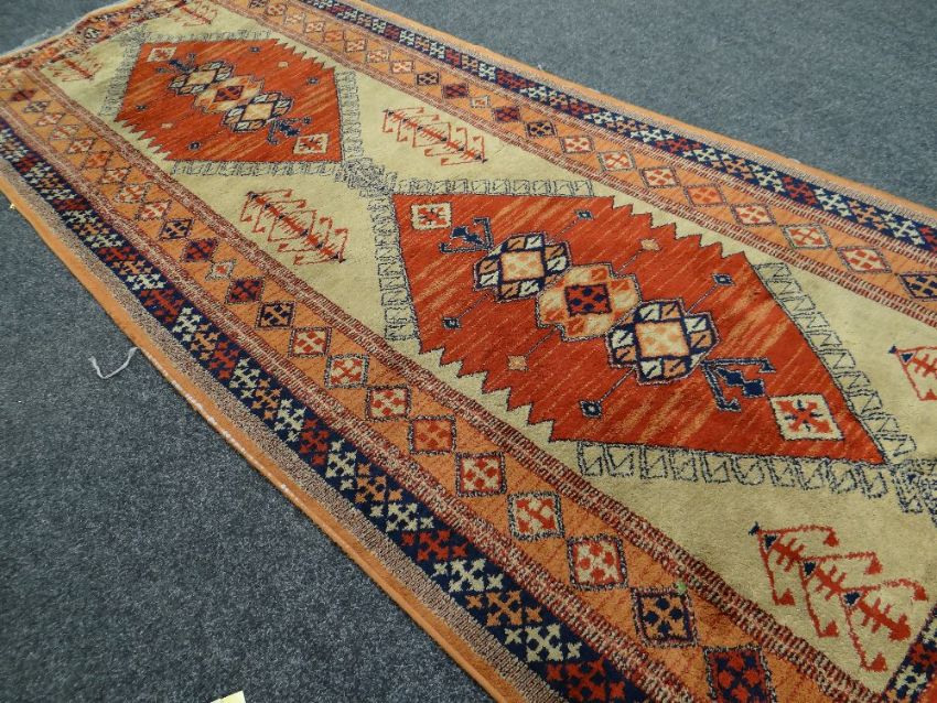 A Turkish woollen geometric patterned runner in blue & orange ground, 2.24m long