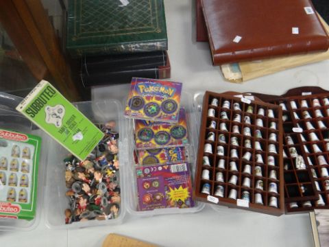 Collection of souvenir pottery thimbles, case of Panini-type football stickers and Pokemon collectables together with a tub of Panini famous football player figures ETC