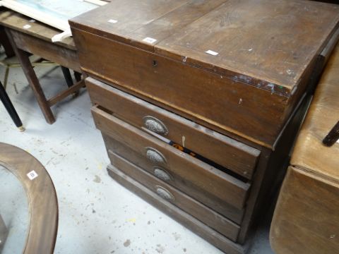 A vintage four-drawer oak chest with two-door chest top and containing a selection of vintage artist's materials ETC