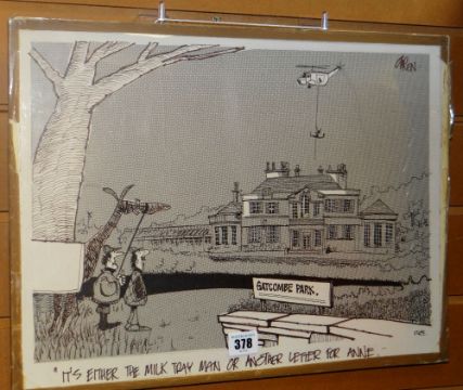 GRENFELL 'GREN' JONES MBE (1934-2007) original drawing - humerous satirical cartoon, captioned 'It's either the milk tray man or another letter for Anne'', signed and dated 10.04.89, 36 x 46 cms (unframed, laid to board)