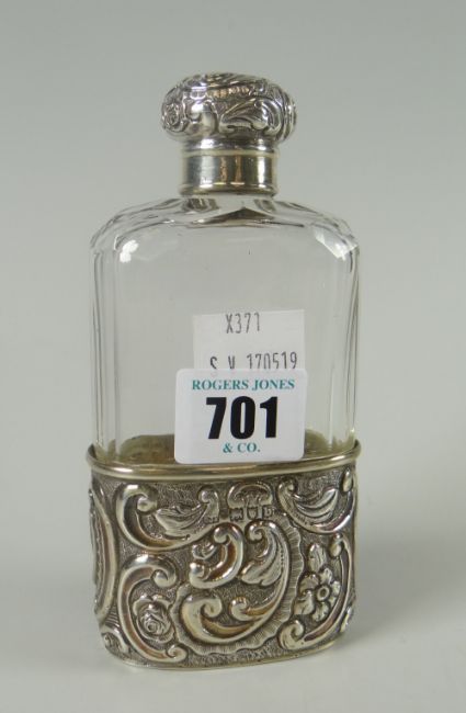 A Victorian silver mounted faceted glass hip flask with raised foliate decoration and cartouche, marks for London 1897