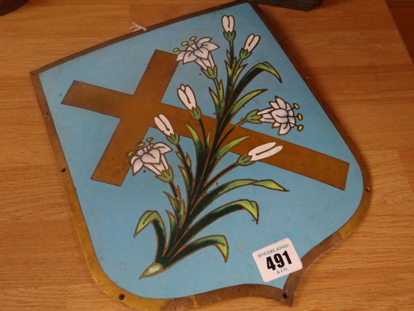 A nineteenth century brass enamelled shield / plaque (possibly religious) decorated with enamelled lilies and cross