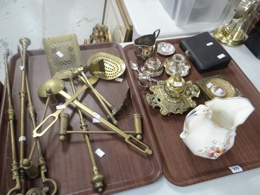 A good antique brass decorative lidded inkwell, an antique floral painted jug, a cased part set silver back sewing set, sundry items of EPNS, a brass poker and matching coal tong companion pair and other items of brassware