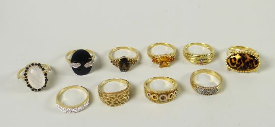 Ten various modern rings including QVC, gemstone set, all believed to be hallmarked for 9ct, 42gms Please note: no condition reports on this lot, not tested, hallmarks, weights and measurements are approximate and not guaranteed, prospective buyers are advised to check jewellery lots in person