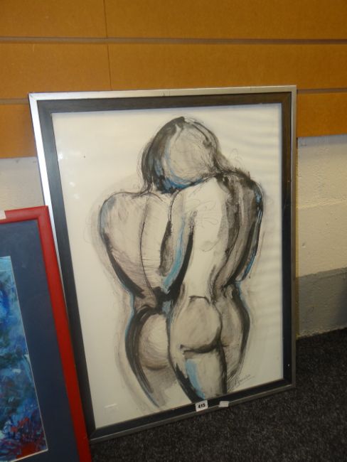 A blue & black ink wash drawing - the rear profile of a naked female, signed H BREINSKYON, 69 x 49cms