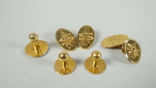A set of vintage believed yellow gold gentleman's cuff links and studs (one stud missing), the cuff links monogrammed, total weight 14grams (unhallmarked)