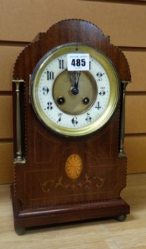 A good Edwardian inlay and box-string mahogany architectural mantel clock having brass pillars and circular dial bearing Arabic numerals to the enamel chapter ring, French 8-day movement and chiming on a gong, 31cms high