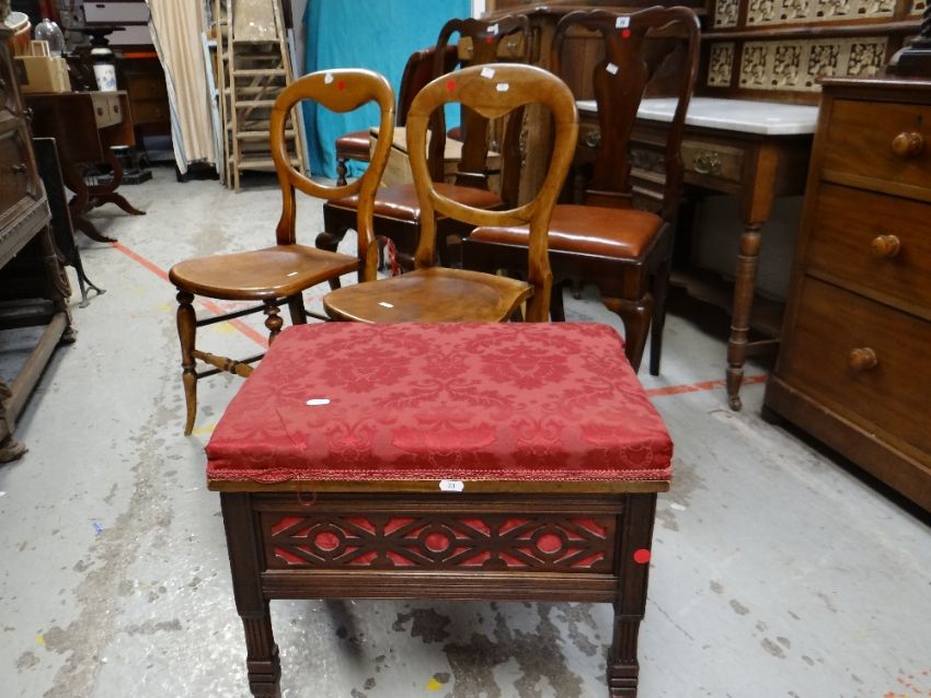 Two good vintage balloon back kitchen chairs, a pair of splat back dining chairs with drop in seats and an excellent carved antique piano stool with upholstered cushion top
