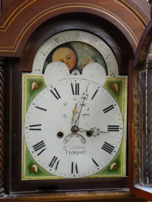 A Victorian mahogany encased painted dial eight-day longcase clock, signed William Latch of Newport, the dial with rolling moon and maritime dial, bearing Roman numerals and subsidiary dials