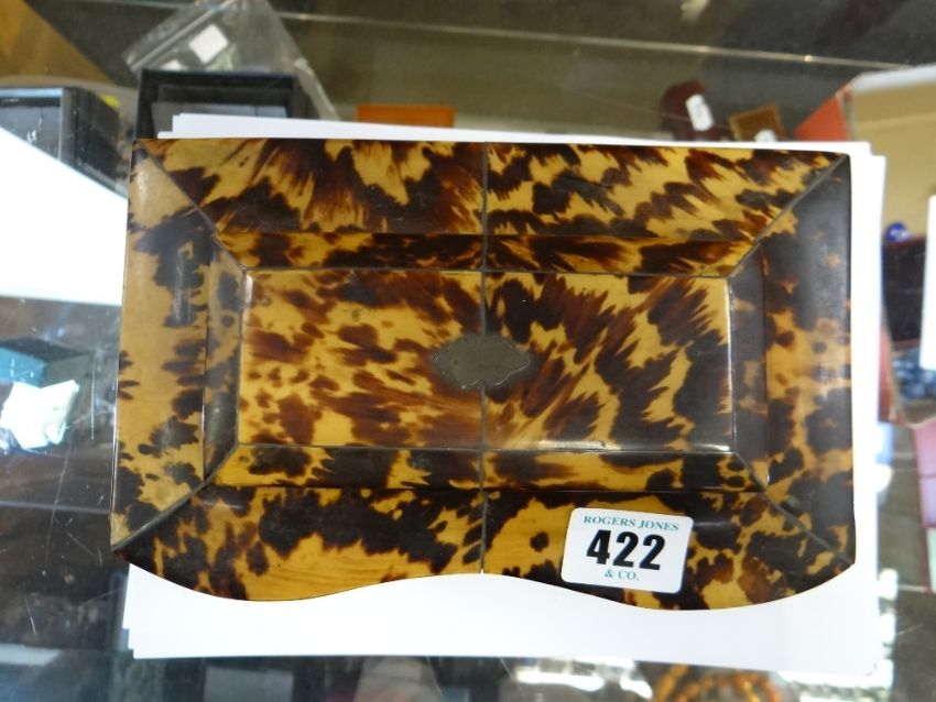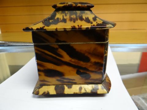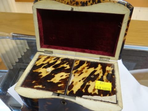A REGENCY TORTOISESHELL SERPENTINE TEA CADDY on original four-corner bun feet, the hinging lid revealing twin compartments with lift up lids and with felt-lined lid interior, 19cms wide (chips to areas particularly internally)