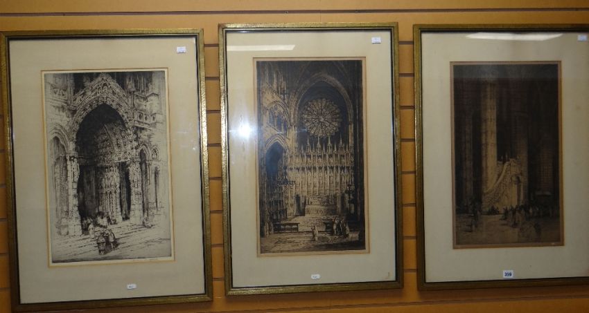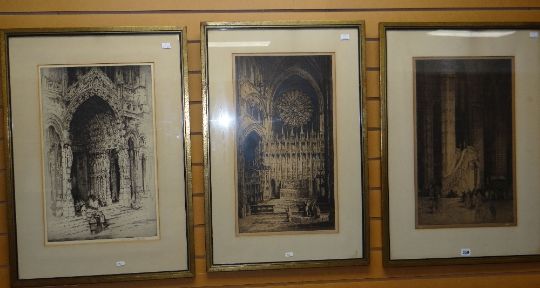 ANDREW AFFLECK etchings, a pair and another - each of historical architectural scenes including entitled verso a 'Moorish Arch, Toledo', all 56 x 34cms