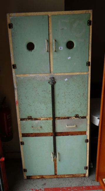 A VINTAGE 'SHEER PRIDE' BLUE AND CREAM PAINTED METAL KITCHEN CABINET with cupboard top and base, pull-down front