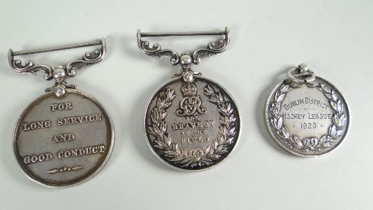 MEDALS being WWI period George V Bravery in the Field medal together with George V Long Service and Good Conduct medal, both engraved to J Oarsgood, Royal Berkshire Regiment, together with silver medal for the Dublin District Hockey League 1920 to J Oarsgood.