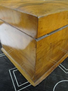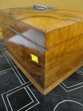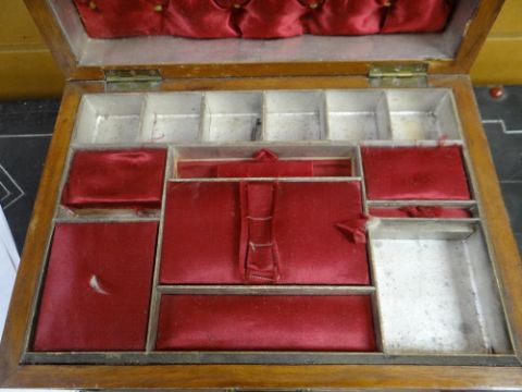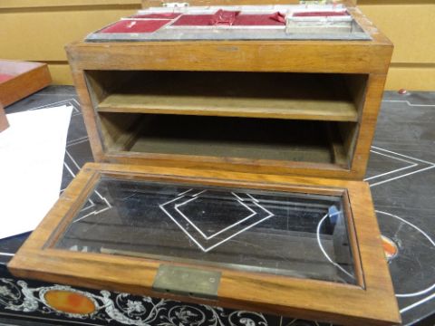 A GOOD VINTAGE WALNUT JEWELLERY CABINET having two base drawers and hinging lid to reveal compartmented interiorThere are surface scratches to the top, there is also some corner wear.The top cushion looks good and all the buttons are present.The felt in the lower section has some wear.The glass is all good, no issues.The drawers, the drawer handles and the felt inside the drawers all look good. The drawers also slide well.The hinges are also good.The key is present and the lock works well