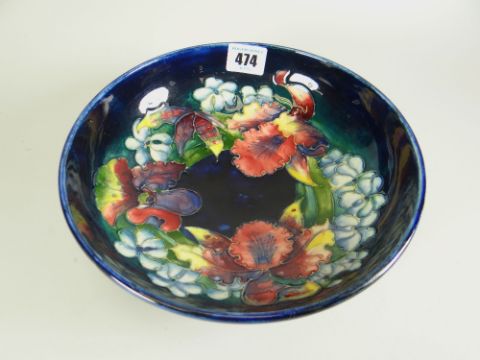 A MOORCROFT BLUE GROUND FOOTED CIRCULAR BOWL, the interior decorated with various tube lined multicoloured flowers, 22cms diam.