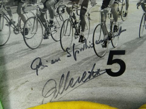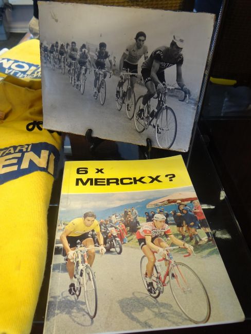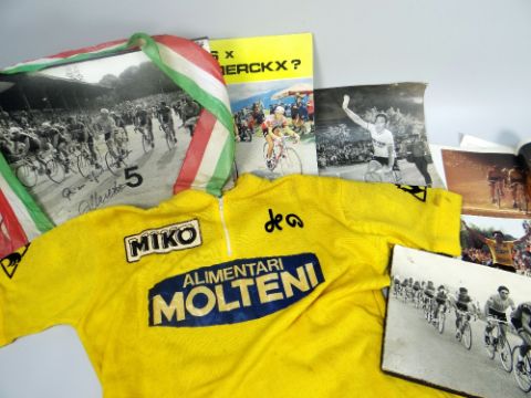 The Le Coq Sportif cotton jersey with original zip, stitched silk 'Almentari Molteni' sponsor label and cotton 'Miko' label front and back and with three section lumbar pocket. The green white and red banded sash signed by Merckx. Black and white photos etc