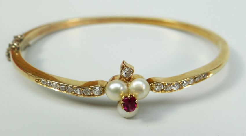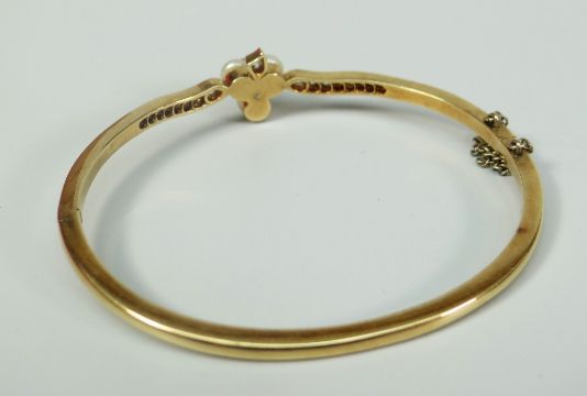 YELLOW METAL DIAMOND, RUBY AND PEARL BANGLE the stones arranged depicting the playing suit of 'Clubs'. 10 grams approximately.