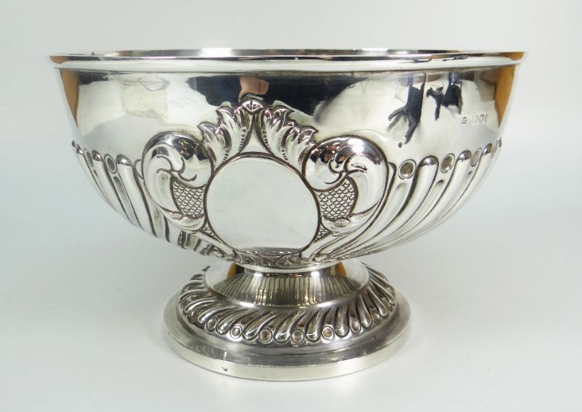LATE VICTORIAN SILVER CIRCULAR PEDESTAL BOWL OF FLUTED FORM with blank oval cartouche within scroll border. London 1893, James Wakely & Frank Clarke Wheeler, 28 cm diameter 17.5 cm high, 35 troy ounces approximately.