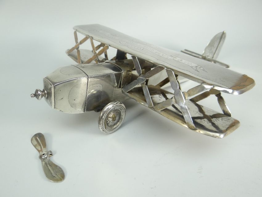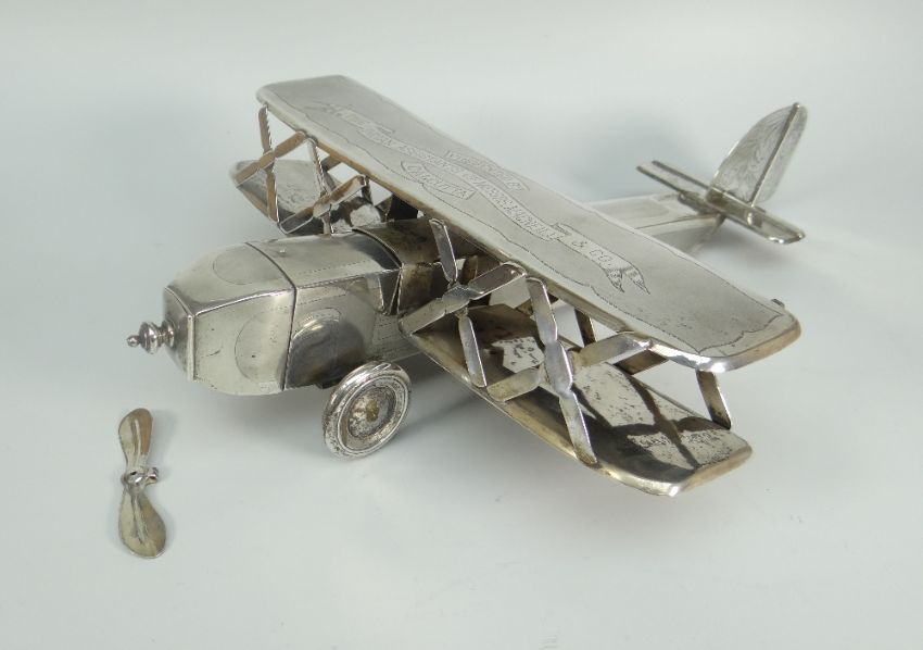 EARLY 20TH CENTURY WHITE METAL TWO SECTION MODEL OF A BI PLANE with engraved inscription to wings "Presented By The Indian Assistants Of Messrs, Macneill & Co Calcutta". Further inscription to underside "Made By B. Sirkar & Sons, Manufacturing Jewellers, Guinea House Calcutta". 42 cm long x 32 cm wide, believed Indian silver.