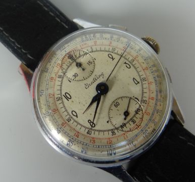A GENT'S BREITLING CHRONOGRAPH WRIST WATCH CIRCA 1940s, the case numbered 589528 / 178 having a silvered dial with applied Arabic numerals, outer telemetre & base scales, two top and bottom registers recording minutes & continuous seconds, within circular case in chrome / steel, diameter measures approx. 35mm, later leather strap