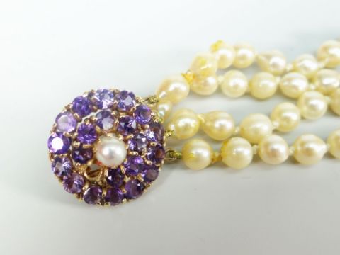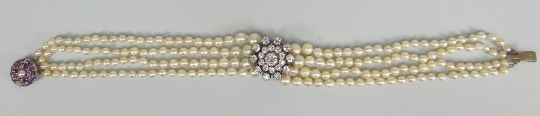 A SUPERB FOUR ROW PEARL, DIAMOND & AMETHYST CHOKER the amethyst fastener centred with a pearl and the floral diamond centrepiece composed of ten outer diamonds, ten inner diamonds and a larger raised centre stone, all diamonds old round cut, diamond weight 8cts approx totalOne amethyst stone is missing.