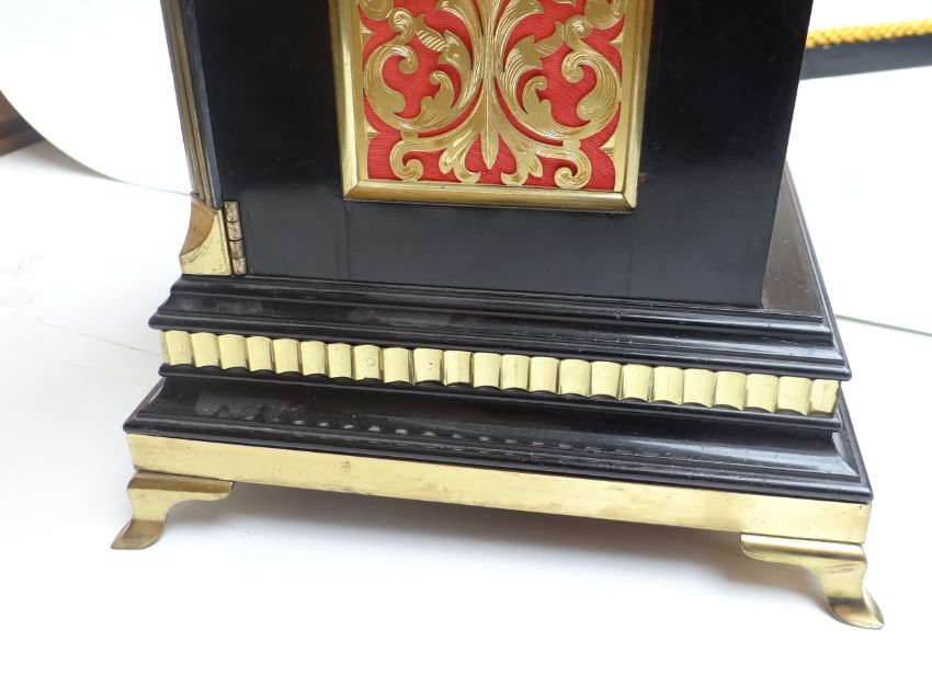 A GOOD LATE VICTORIAN ENGLISH EBONISED BRACKET CLOCK BY BIRCH & GAYDON, LONDON, eight day movement with Westminster chime, the case with bell top pediment having a brass handle above gilt dial with subsidiary 'strike/silent' and 'slow/fast' dials to the arch, maker's name and address on silvered chapter ring with Roman numerals and with Rococo spandrels. The stepped case having applied gilt metal mounts, filigree and red silk side panels, all on gilt metal bracket feet, 42.5cms high Condition Report: excellent, appears to be complete without later replacement parts, case structurally sound without signs of splitting or raising, working at time of cataloguing but without guarantee - please view. Door key and winder key with us. Provenance: Cardiff Estateslight paint cracking at the top of each side.