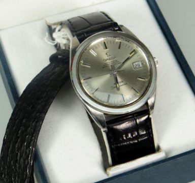 OMEGA AUTOMATIC CHRONOMETER SEAMASTER with retailers mark 'Meister' with strap and with associated box. Circa 1960's. Condition Report: Movement not confirmed as case back has not been removed. Appears ok overall some surface wear and minor scratches. Not tested long term.There are a few surface scratches to the glass. There is also what looks like a scratch on the dial.