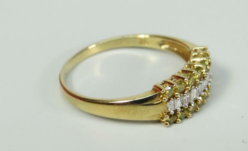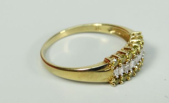 9CT YELLOW GOLD THREE ROW YELLOW AND WHITE DIAMOND RING. 1.9 grams approximately. Condition Report: Good overall condition with no stones missing. Provenance: Estate, instructions from Vale of Glamorgan solicitorSize T