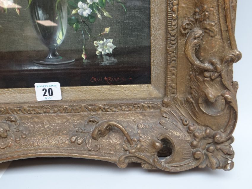 CECIL KENNEDY (1905 - 1997) oil on canvas - study of flowers in a glass vase, signed and entitled in handwriting 'Agualigia' on The Fine Art Society label verso and dated August 1950, 29 x 24cms