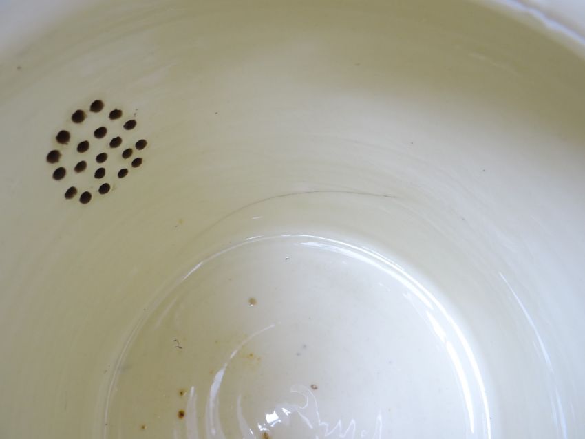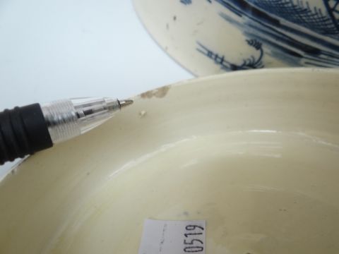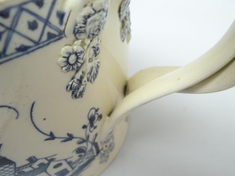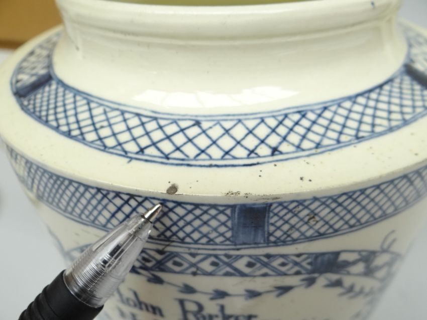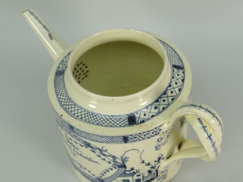 AN EIGHTEENTH CENTURY CREAMWARE OVERSIZE TEAPOT decorated with underglazed blue landscape decoration and inscribed 'John Parker Nettlebed. Oxfordshire. 1778', the cross-over ribbon handle with moulded floral terminals, the spout of tapered straight form, circular based and lidded with pear-shaped knop, 23cms high Provenance: by descent, Cardiff EstateThere is a hairline crack to the side of the body.There is a chip to the base, there are a few small nibbles to the side edge and a few chips to the underside of the lid. I could not see any restoration.